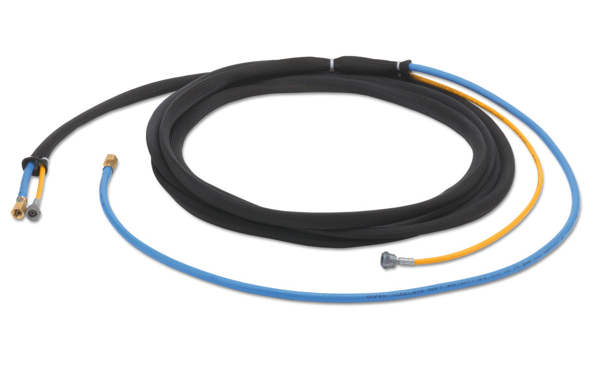 Die WAGNER AirCoat HD-Doppelschläuche bestehen aus einem Materialschlauch, welcher das Material vom Spritzgerät zur AirCoat Pistole befördert und einem Luftschlauch, der die Druckluft vom Kompressor zur AirCoat Pistole bringt. Der flexible Doppelschlauch wird von einem schwarzen Monophil Schlauch geschützt, der nebenbei auch für ein angenehmes Schlauchhandling sorgt.