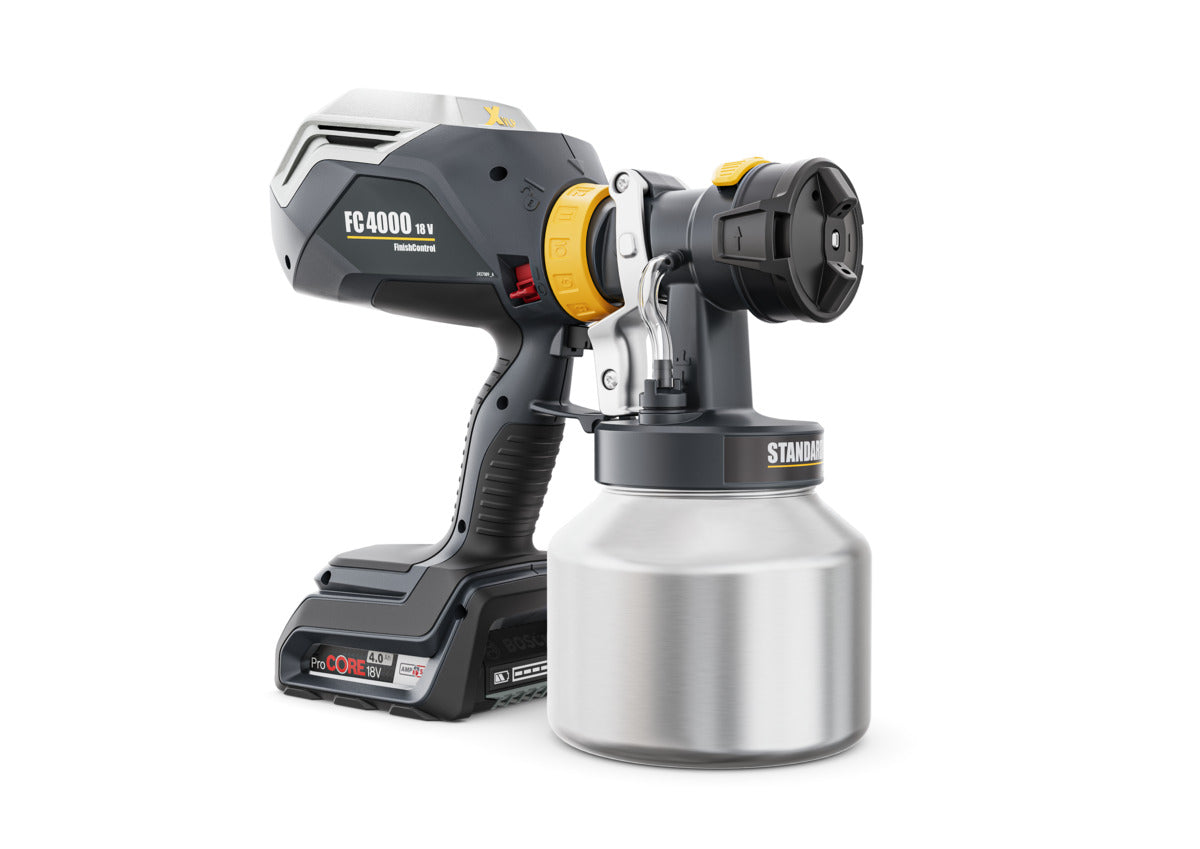 Das Akku-Farbsprühsystem FinishControl 4000 18V überzeugt durch uneingeschränkte Bewegungsfreiheit bei der Beschichtung kleinerer Objekte und anderen Lackier-, Reparatur- und Renovierungsarbeiten. Mit dem Sprühaufsatz StandardSpray ist FinishControl 4000 18V der ideale Partner für die Verarbeitung aller lösemittelhaltigen und wasserbasierenden Standard-Lacke. Die hervorragenden Akkus in Kombination mit dem bürstenlosen Motor sorgen für eine optimierte Laufzeit, längere Lebensdauer und eine optimale Zerstäubungsleistung.